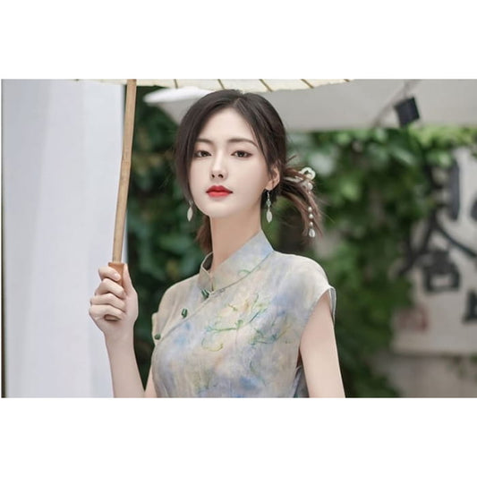 Qipao mi-long à manches courtes et fente imprimée en coupe trapèze / jupe trapèze / ensemble