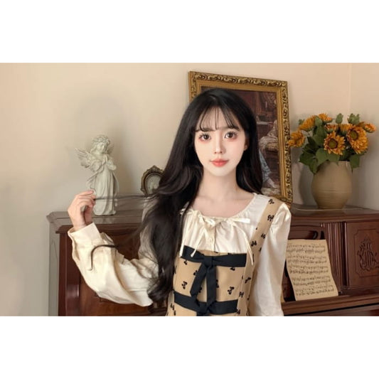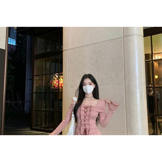 Long Sleeve Square Neck Lace Up Ruffle Mock Two Piece A-Line Dress (Various Designs)