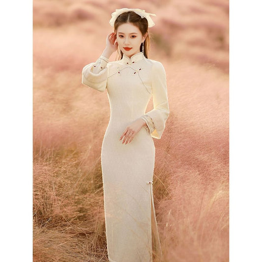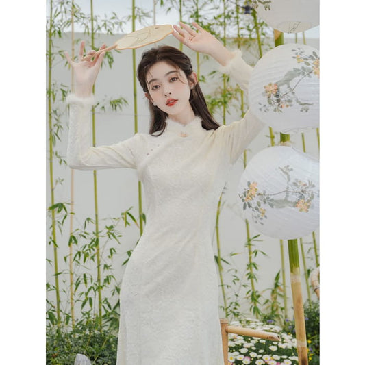 Long-Sleeve Floral Fluffy Trim Midi Qipao