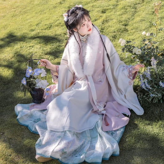 Haut Hanfu brodé à fleurs à manches longues / Gilet à col moelleux / Jupe Mamian à imprimé floral taille haute / Ceinture / Ensemble