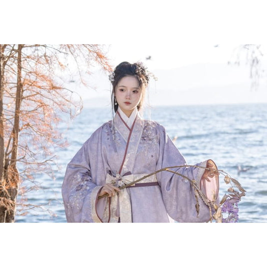 Robe Hanfu à imprimé floral à manches longues / Ceinture / Jupe plissée taille haute / Écharpe moelleuse / Ornement à pompon / Broche / Ensemble
