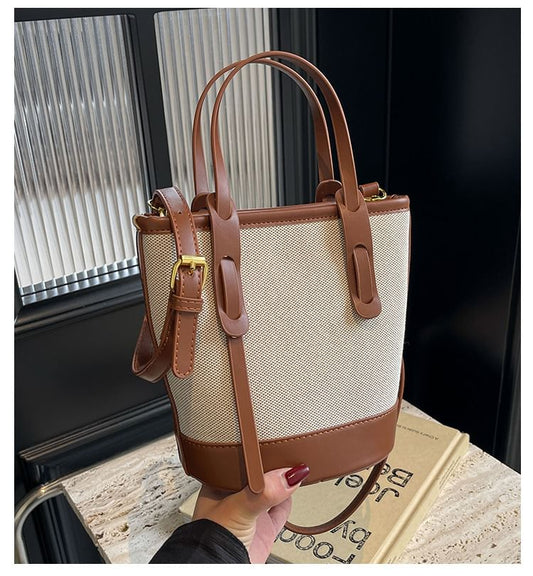 Bag Faux Two Panel Leather Bucket Canvas Tone