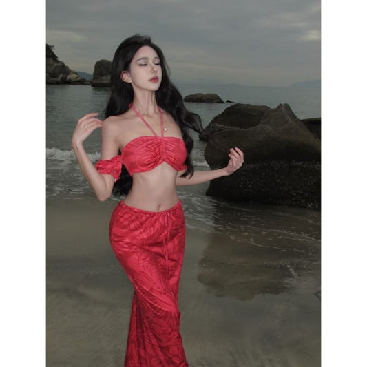 Ensemble : haut court imprimé à épaules dénudées et cordon de serrage + jupe crayon mi-longue taille basse