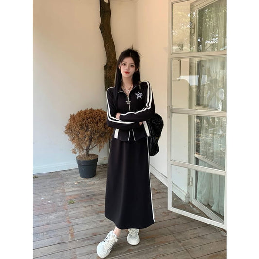 Veste zippée à rayures et col montant / Jupe trapèze mi-longue rayée à taille moyenne
