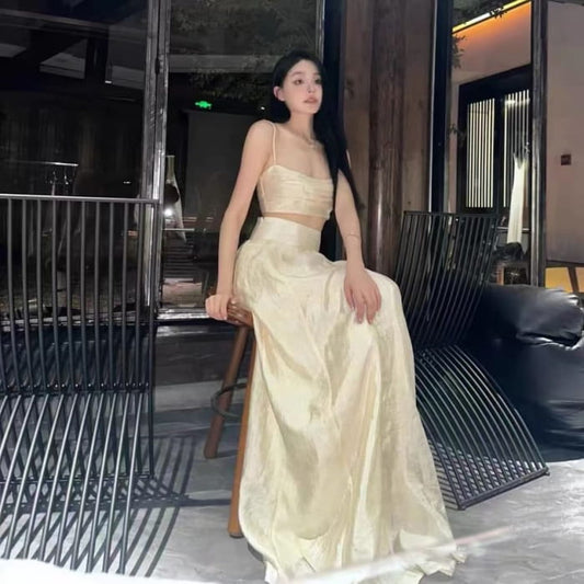 Ensemble : haut court uni à bretelles + jupe trapèze mi-longue taille haute