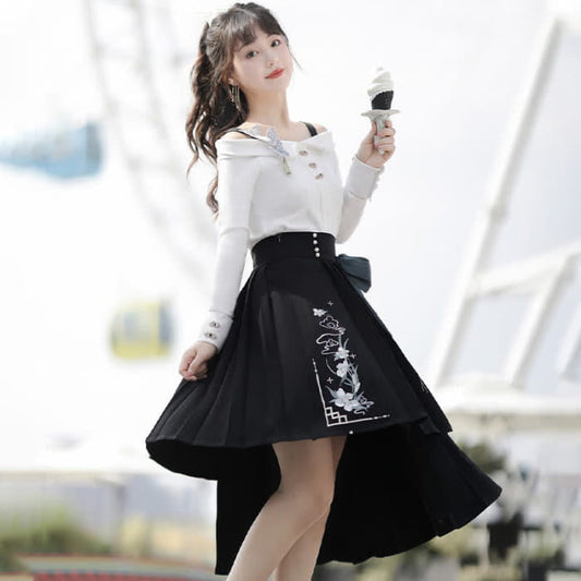 Chemise à manches longues à feuilles noires et jupe plissée brodée