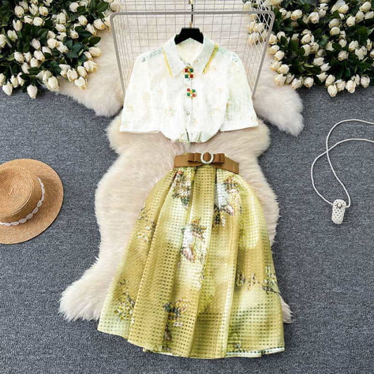Ensemble haut et jupe vintage à imprimé fleuri vert