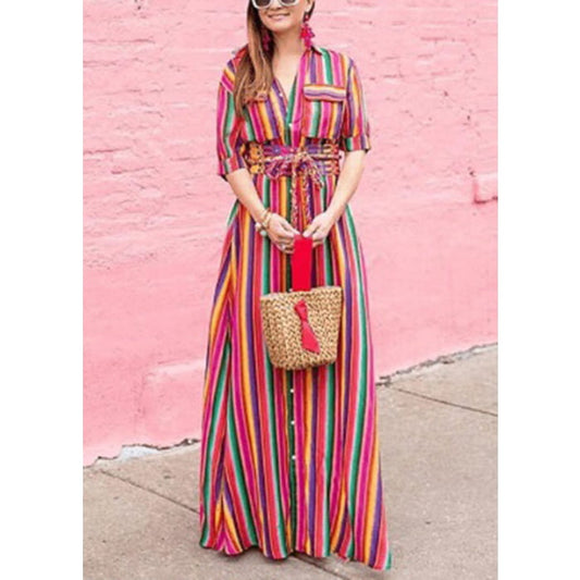 Chemises longues à rayures arc-en-ciel à la mode, boutons noués à la taille, robes d'été VB1040