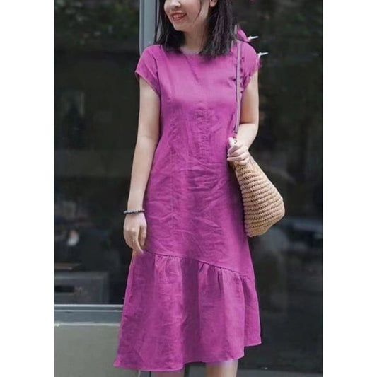 Robe mi-longue asymétrique rouge à manches courtes en patchwork DIY VB1039