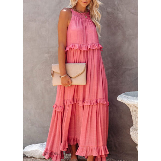 Robe longue patchwork à volants bleus unique pour l'été VB1038