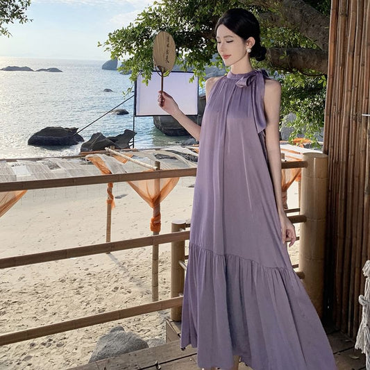 Halter Open Back Plain A-Line Neck Midi Dress