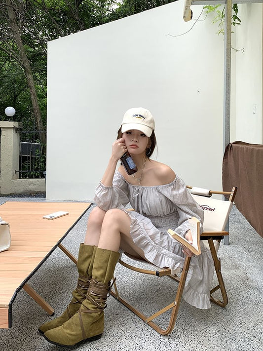 Puff-Sleeve Off-Shoulder Plain Mini A-Line Dress