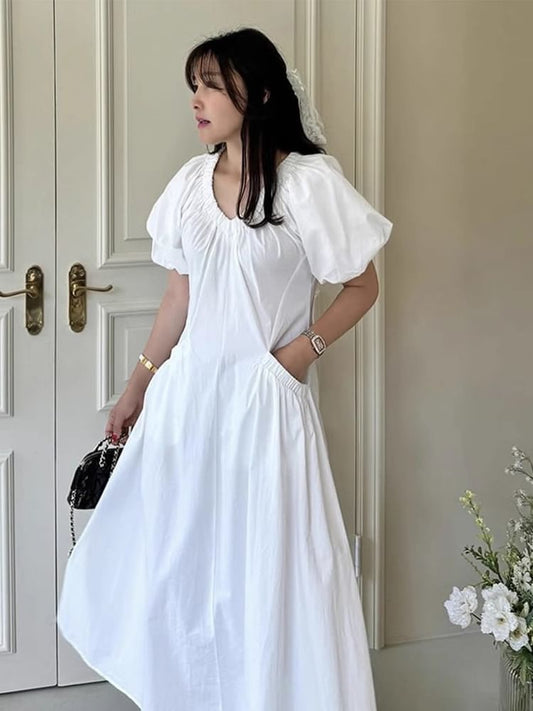 Cap-Sleeve Square Neck Plain Midi A-Line Dress