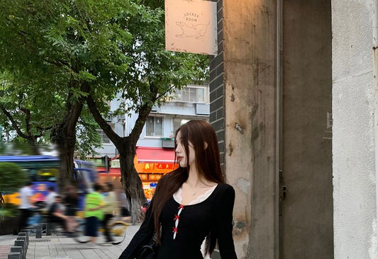 V-Neck Lace Crop Tank Top / Long-Sleeve Scoop Neck Plain Bow Accent Cutout Maxi Mermaid Dress