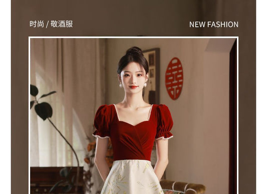 Long-Sleeve Crew Neck Dotted Blouse / Square Neck Plain Velvet Mini A-Line Jumper Dress