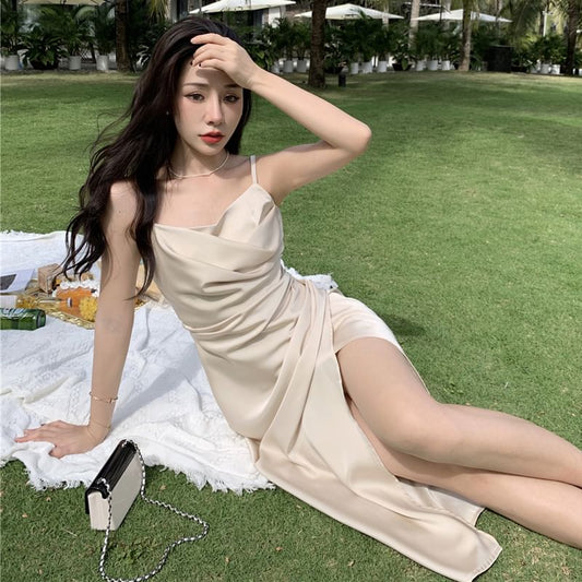 Spaghetti Strap Cowl Neck Plain Satin Slit Midi Sheath Dress