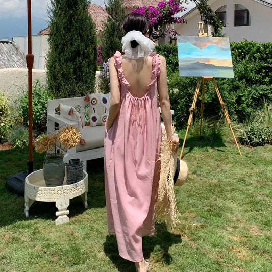 Sleeveless Crew Neck Plain Frill Trim Open Back Maxi Tunic Dress