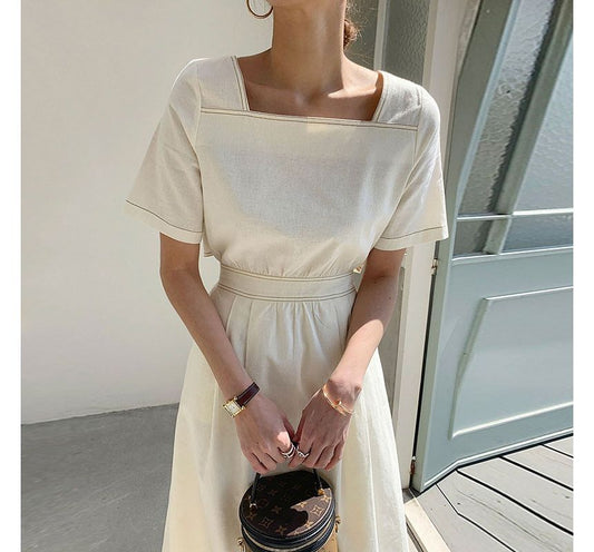 Short-Sleeve Square Neck Contrast Stitching Open Back Midi A-Line Dress