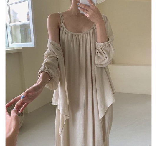 Spaghetti Strap Plain Shirred Midi A-Line Dress / Puff-Sleeve Open Front Jacket
