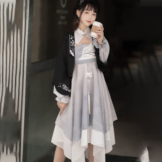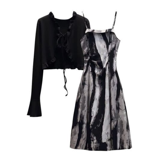 Robe nuisette élégante à imprimé peinture à l'encre et cardigan court noir