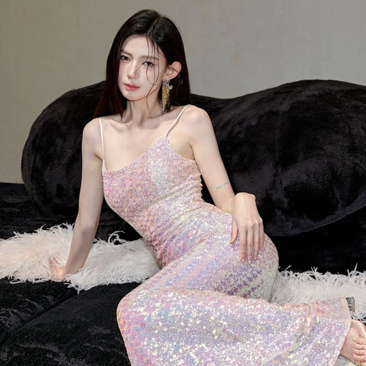 Evening Back Strap Gown Spaghetti Open Trained Sequin Mermaid