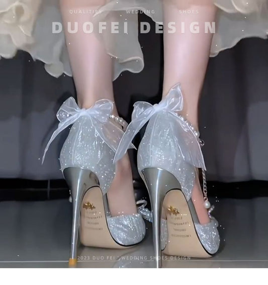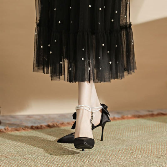 Stiletto Pearl Strap Sandals Bow Faux Glitter Ankle