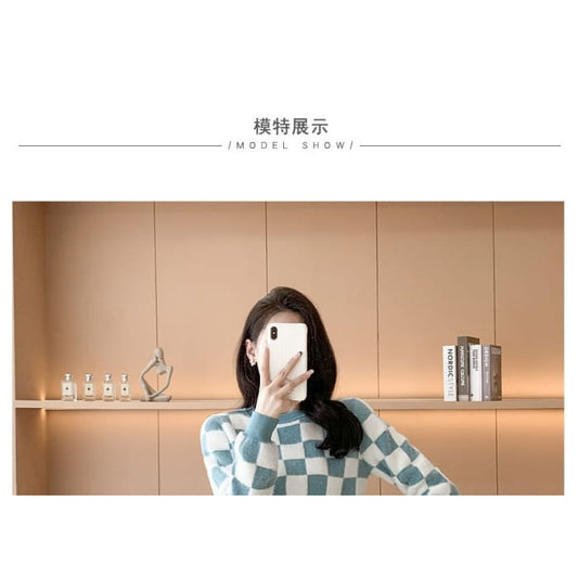 Ensemble : Pull ras du cou à carreaux + Mini jupe droite taille haute