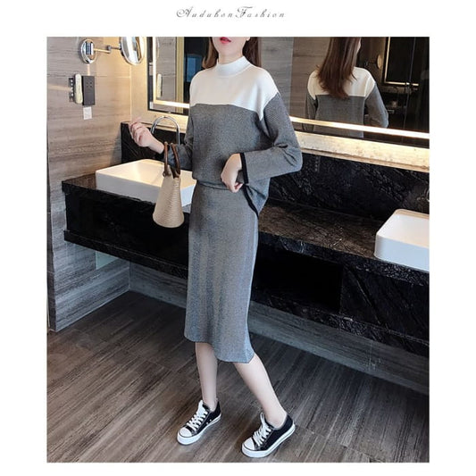 Ensemble : pull bicolore à col montant + jupe droite mi-longue rayée à taille haute