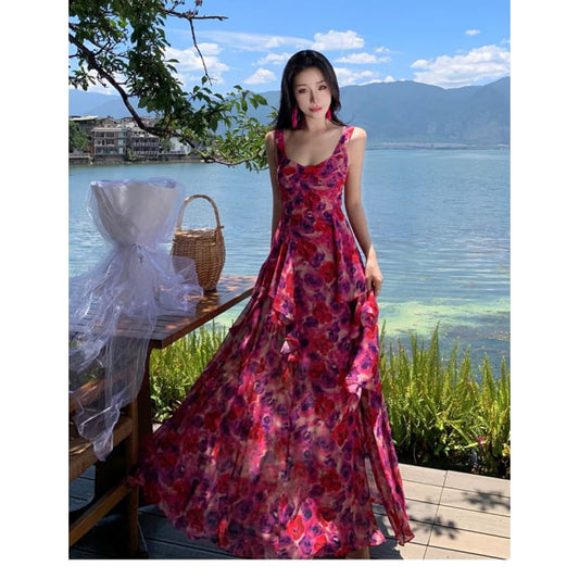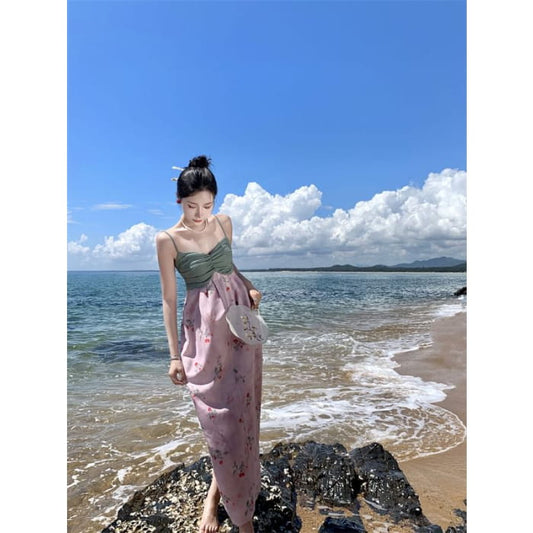 Robe longue d'été à bretelles spaghetti et imprimé floral