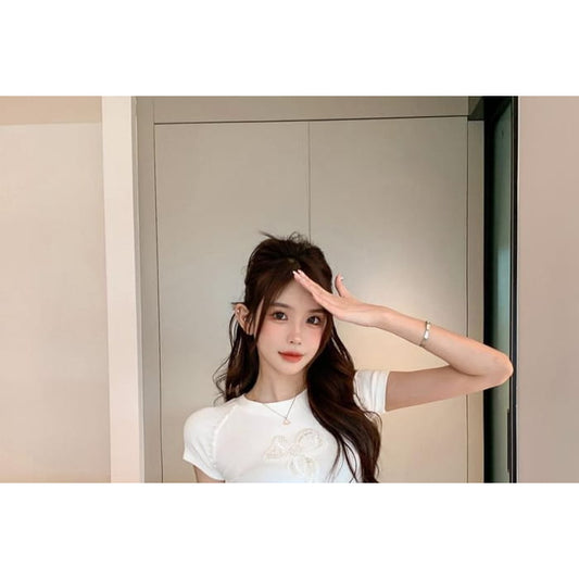 Short en jean coupe droite taille haute à imprimé nœud papillon