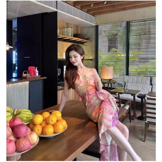 Ensemble : haut court froncé à imprimé floral et col licou + jupe longue sirène taille haute