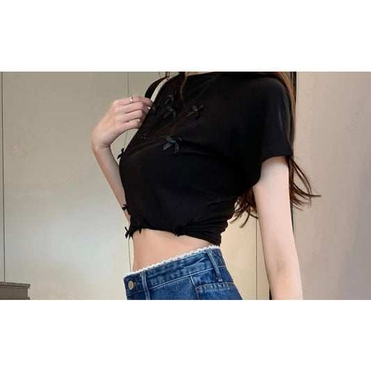Mini-jupe en jean taille mi-haute avec bordure en dentelle