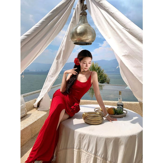Robe fourreau mi-longue asymétrique sans manches à volants et fente unie