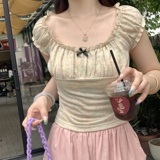 Neck Ruffle Bow Short-Sleeve Square T-Shirt Fit Slim Trim