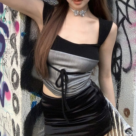 Slim Crop Bow Fit Top Square Tank Neck Two Tone
