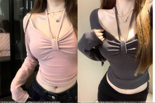 Long-Sleeve V-Neck Plain Bow Back T-Shirt