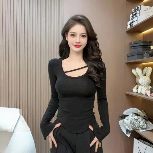 Long-Sleeve Scoop Neck Plain Asymmetrical T-Shirt