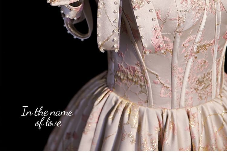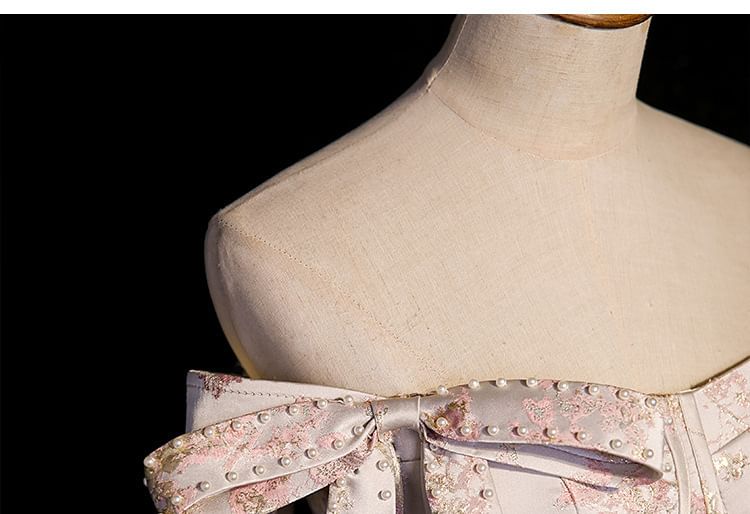 Off-Shoulder Floral Jacquard Faux Pearl Bow A-Line Evening Gown