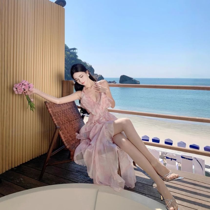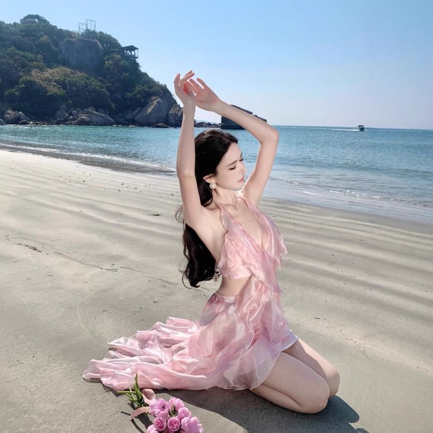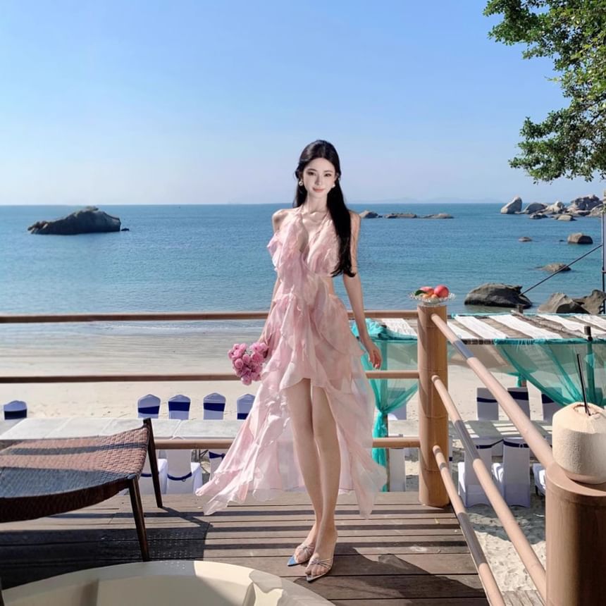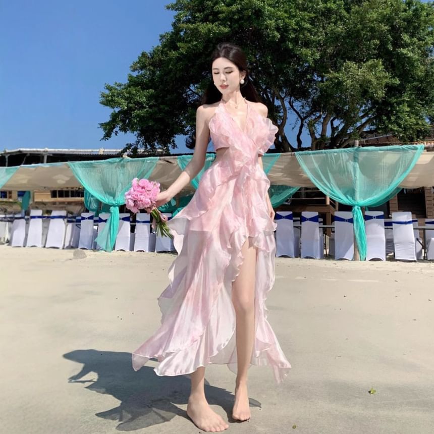 Floral Set: Skirt Top + Halter Midi A-Line Waist V-Neck High Crop