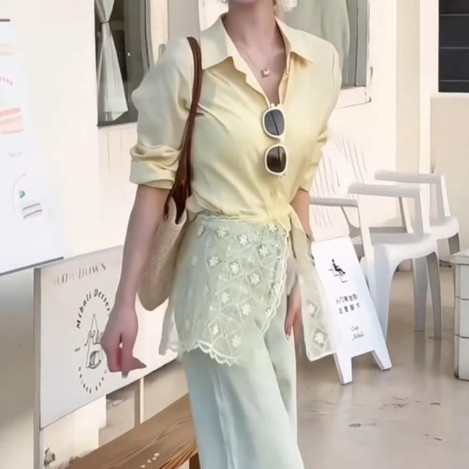 Long Trim Shirt Plain Sleeve Panel Collared Lace