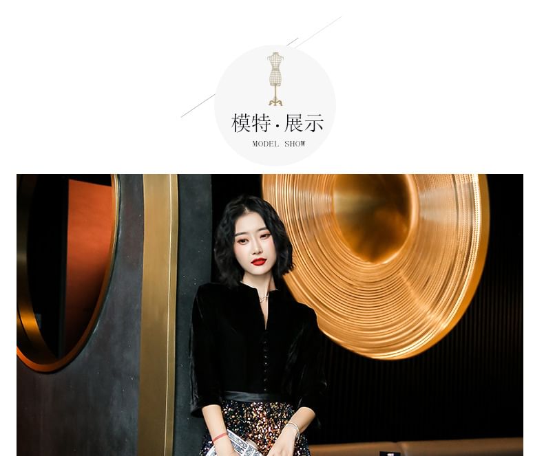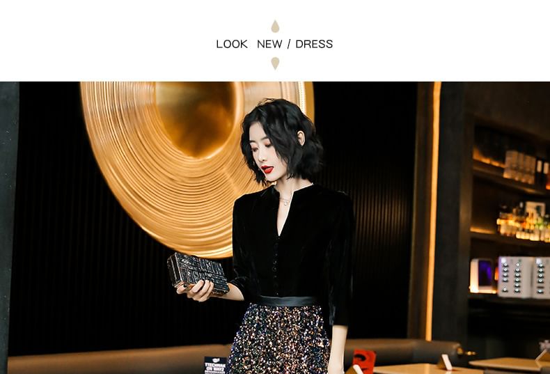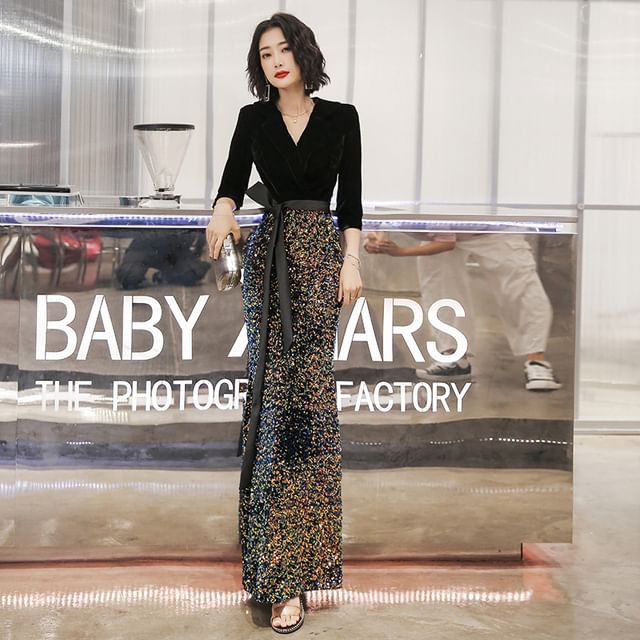 3/4-Sleeve Notch Neck Sequin Panel Evening Gown (Various Designs)