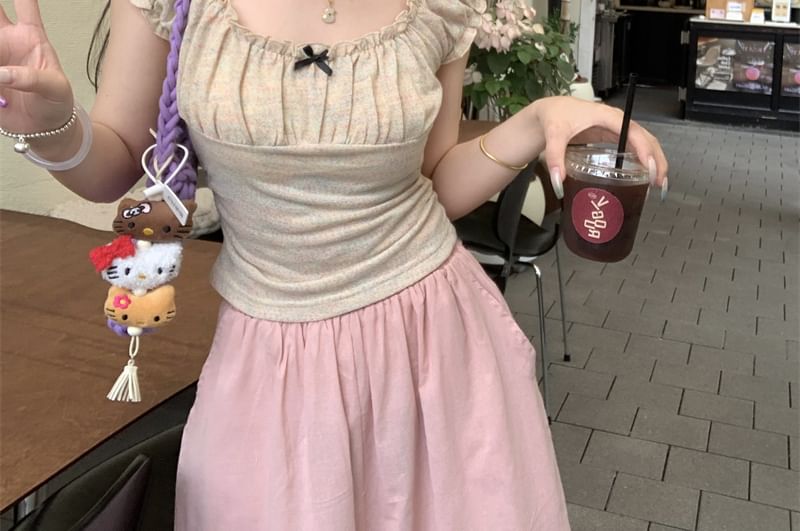 Neck Ruffle Bow Short-Sleeve Square T-Shirt Fit Slim Trim