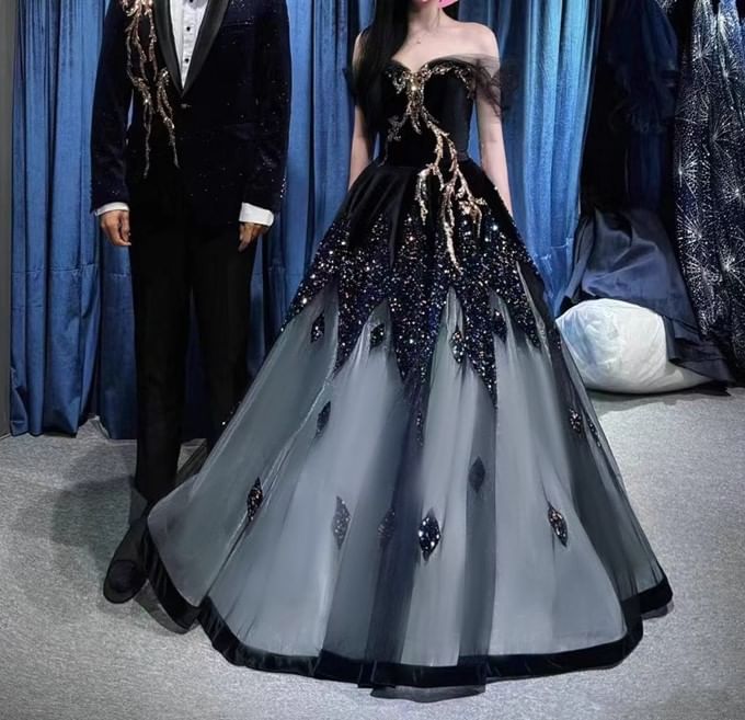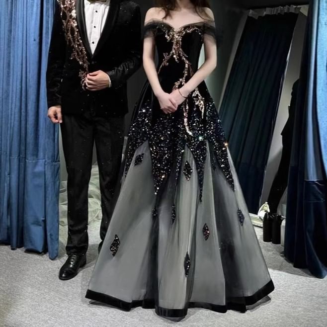Panel Mesh Sequin Off-Shoulder Gown Evening A-Line