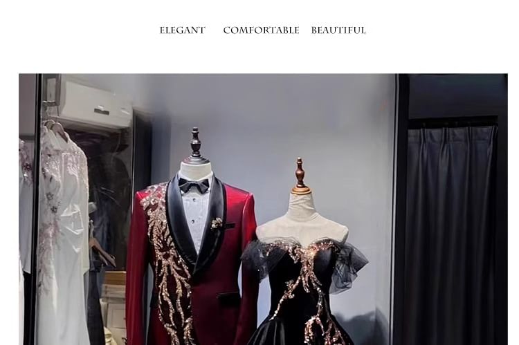 Off-Shoulder Sequin Mesh Panel A-Line Evening Gown