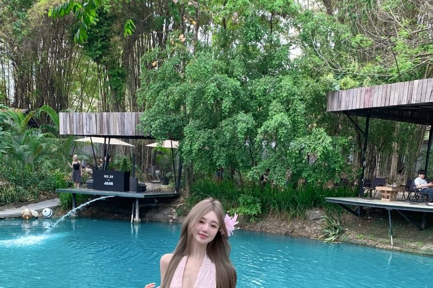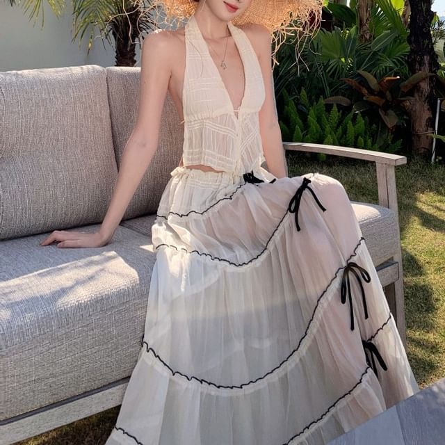 Set: V-Neck Plain Asymmetrical Cropped Halter Top + Low Rise Maxi A-Line Skirt