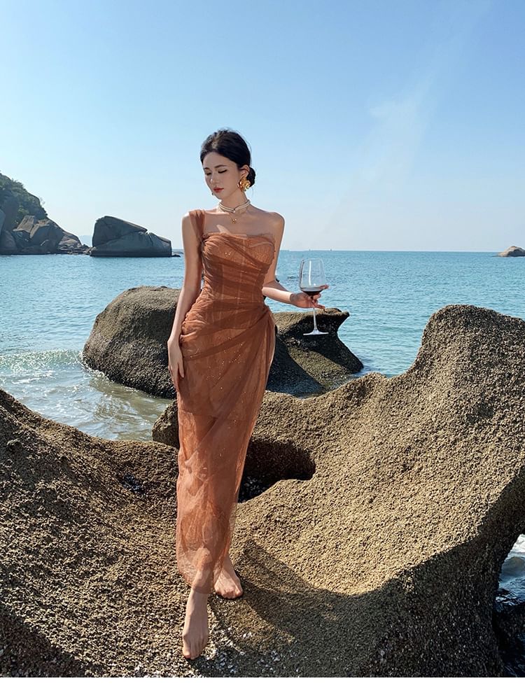 Sleeveless One Shoulder Plain Ruched Slit Lace Panel Mesh Sheath Evening Gown