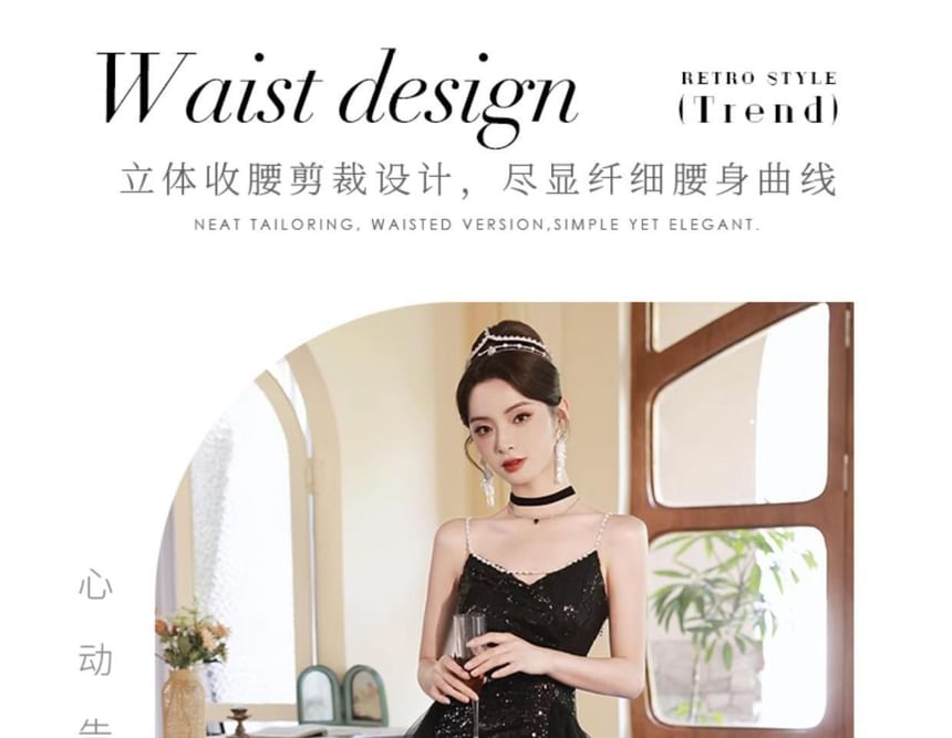 Ruffle A-Line Evening Sequin Strap Side-Slit Spaghetti Gown