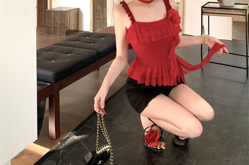 Ruffled Skirt Mini Top / High Floral Pencil Asymmetrical Cami Waist