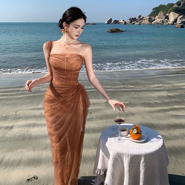 Sequin Evening Maxi Gown Sheer One Shoulder Sleeveless Ruffle