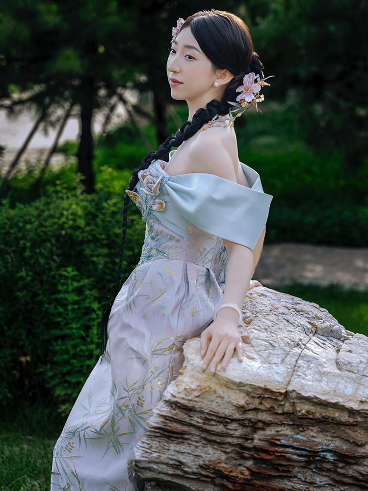 Sleeveless Off-Shoulder Floral Sequin Sheath Evening Gown